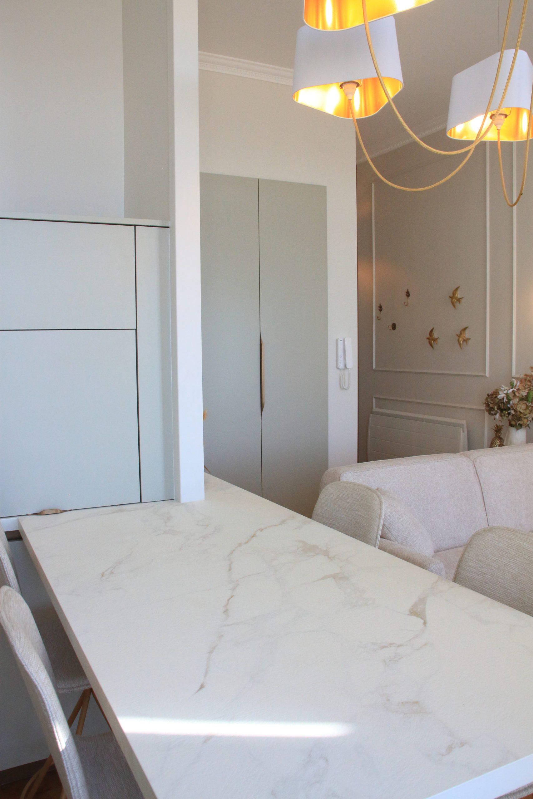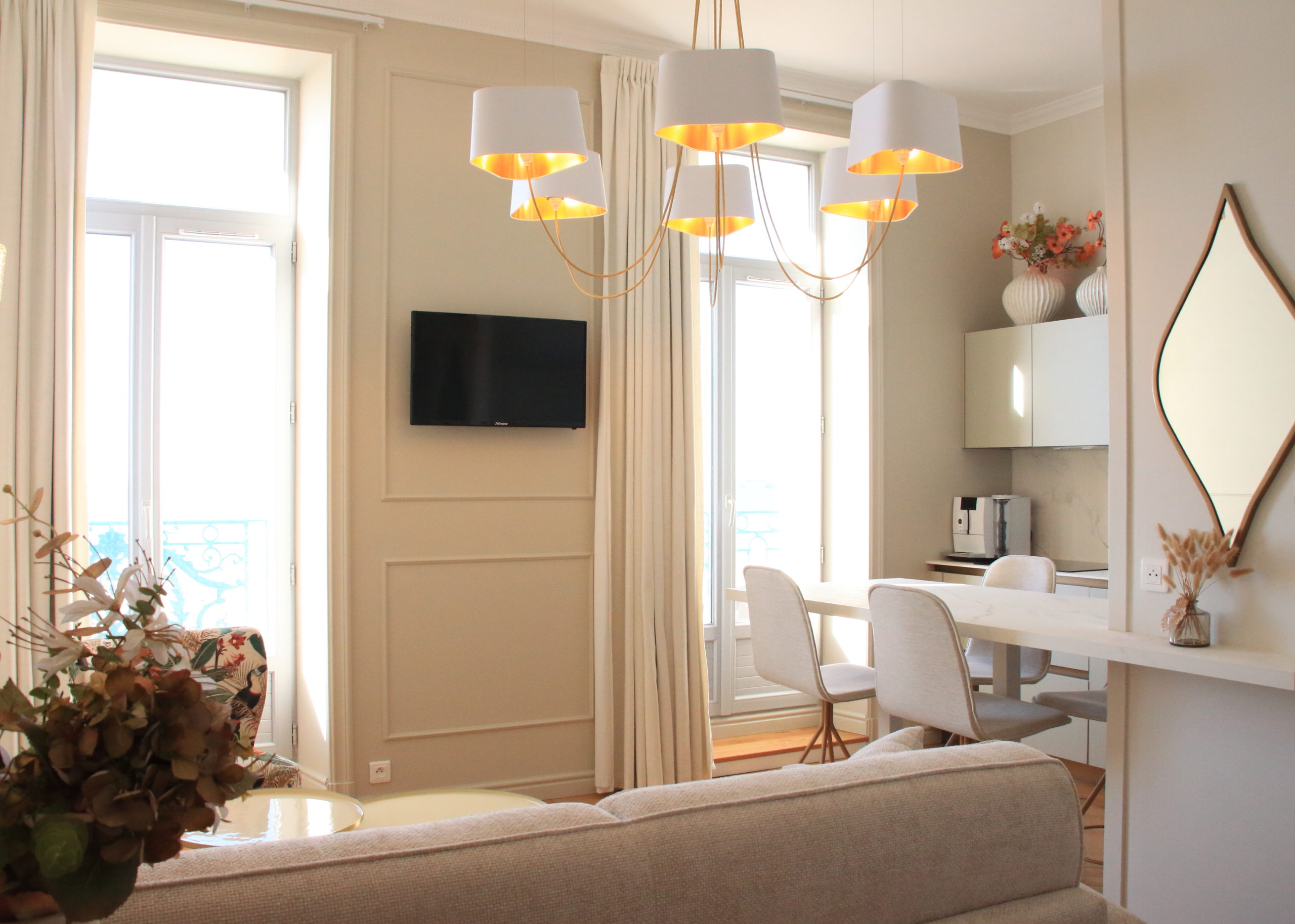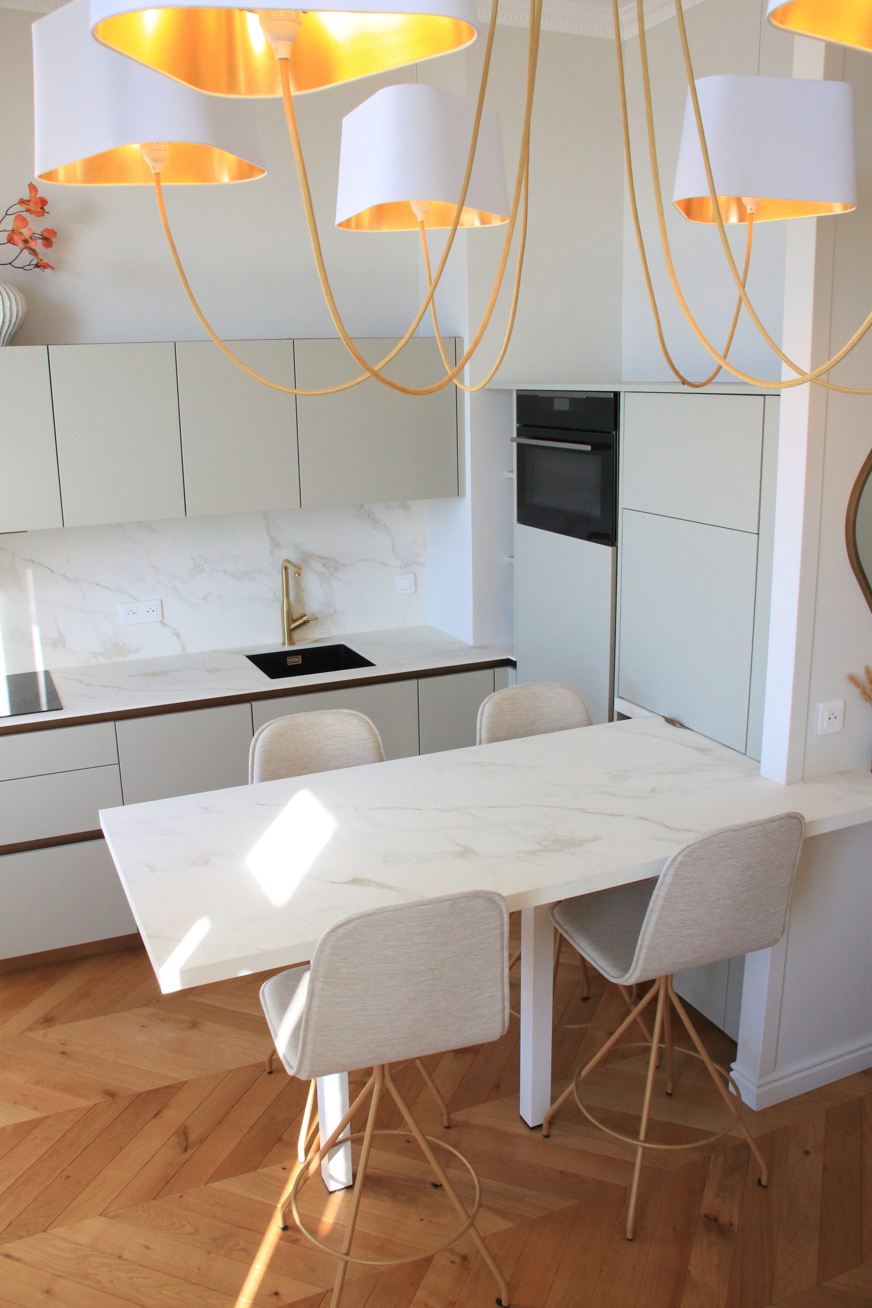 Le choix des luminaires très sculpturaux a été la touche finale pour mettre en valeur la belle hauteur sous plafond.