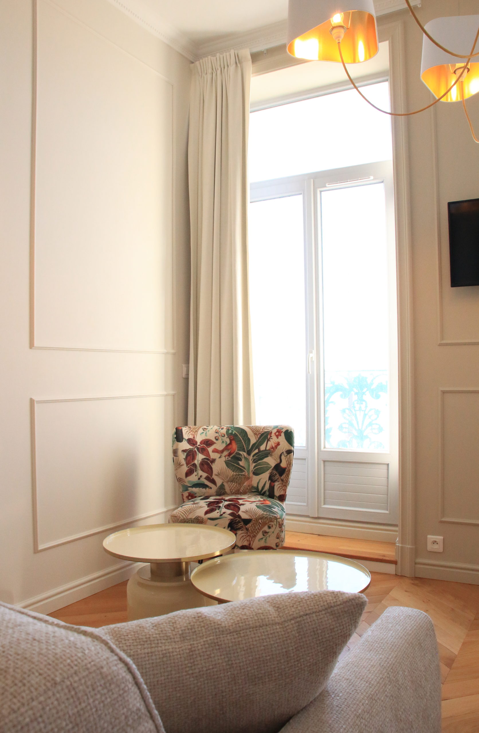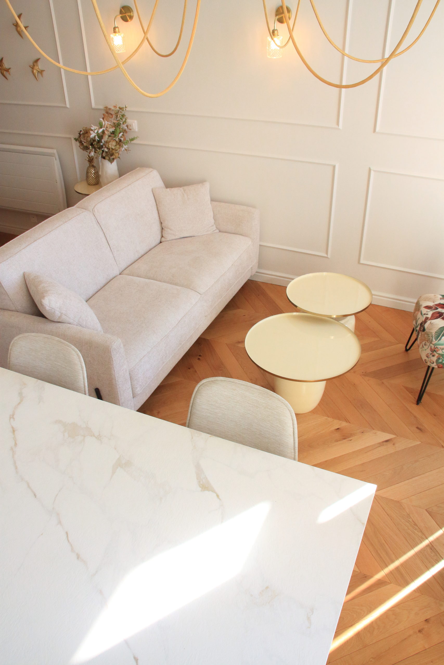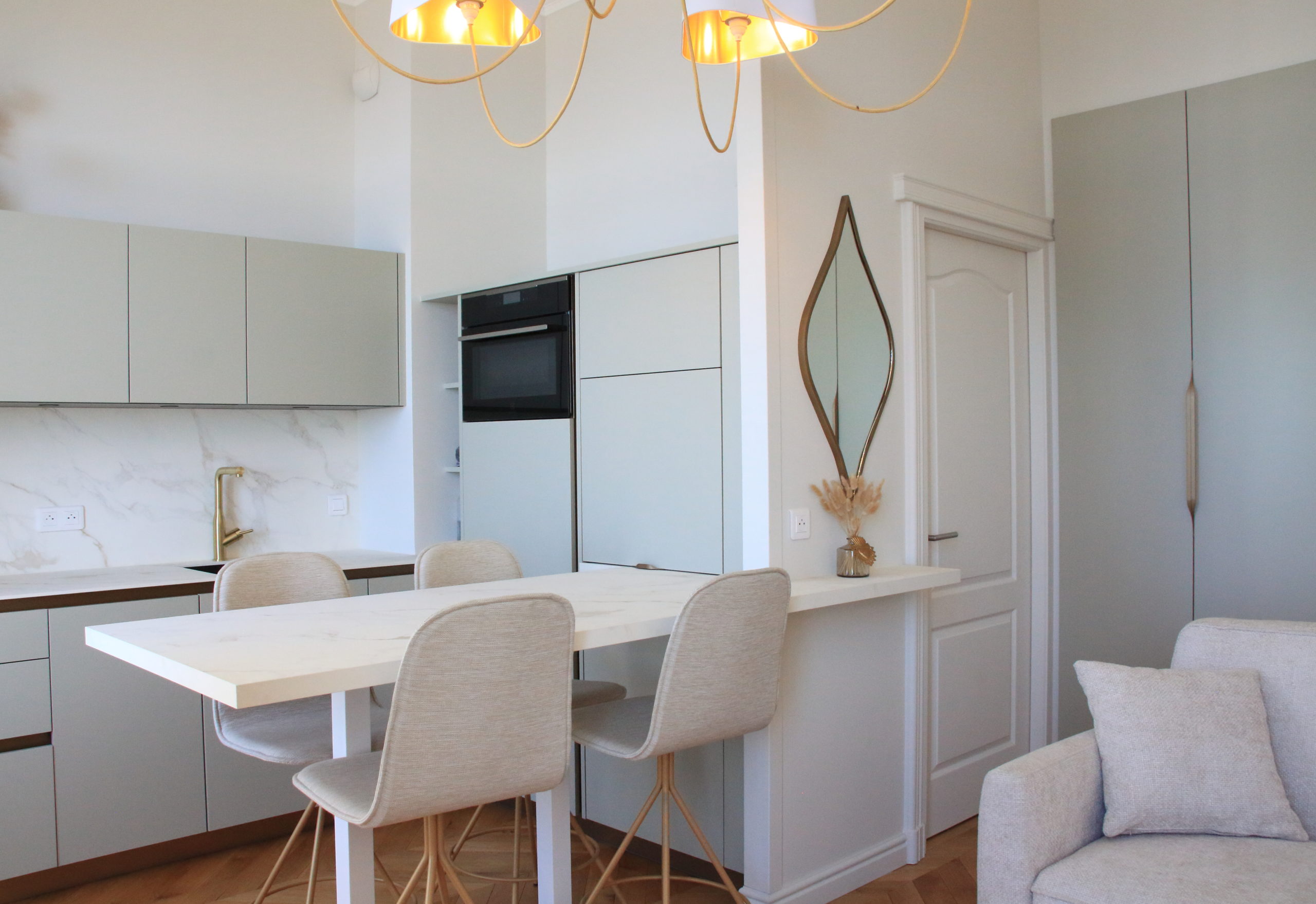 Le choix des luminaires très sculpturaux a été la touche finale pour mettre en valeur la belle hauteur sous plafond.