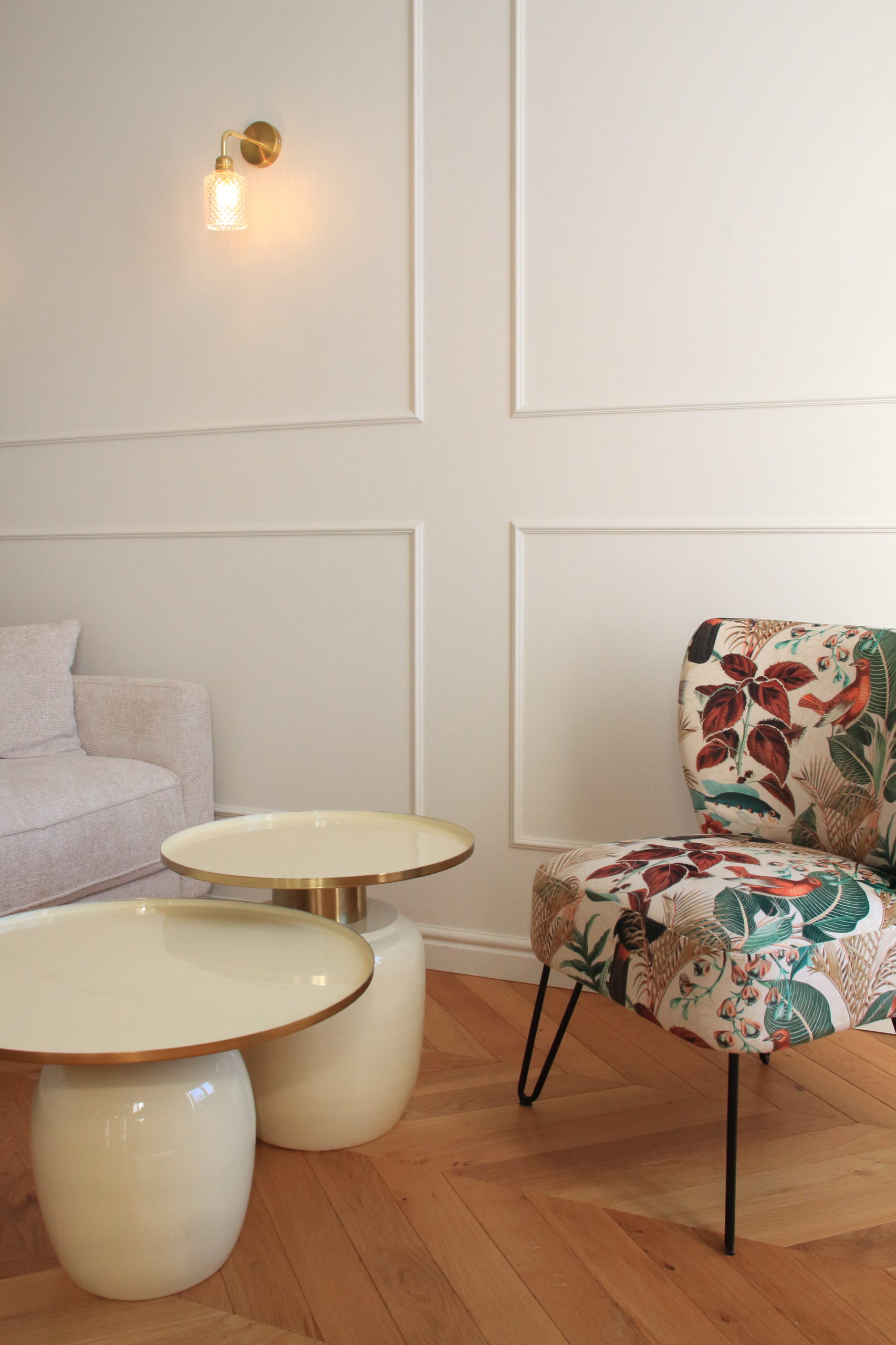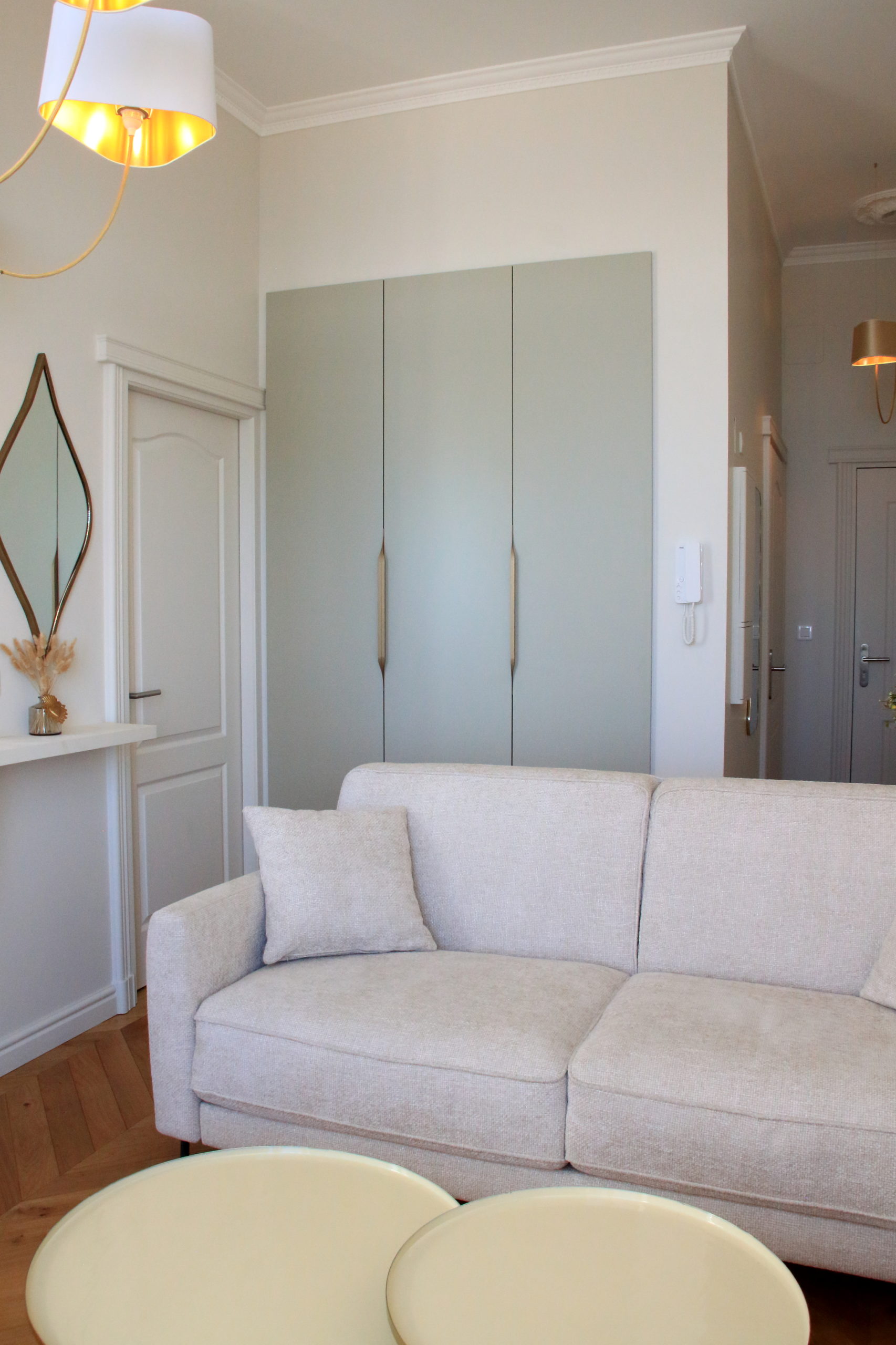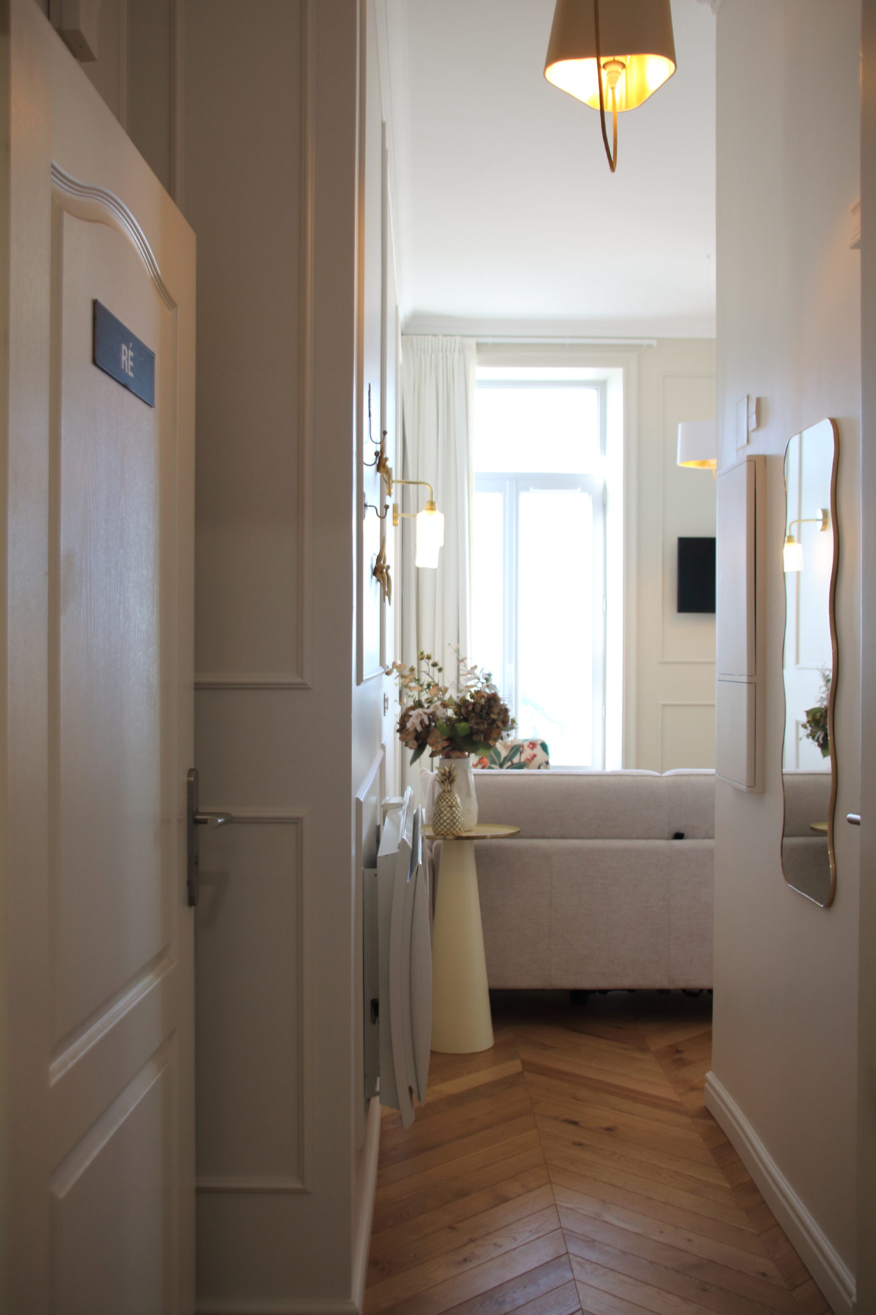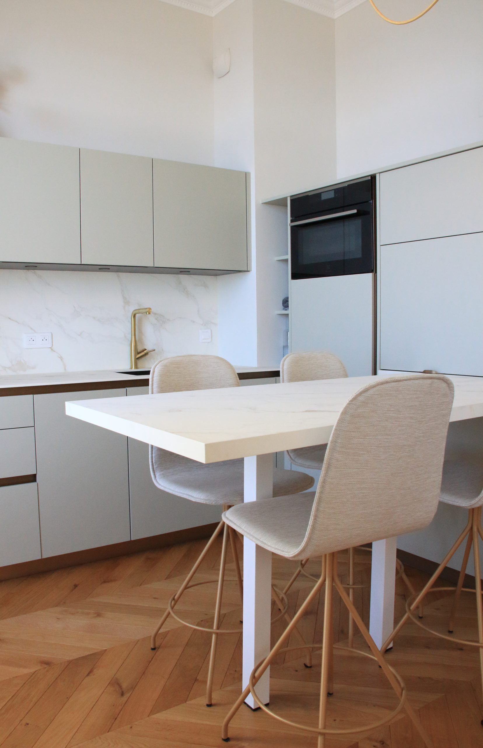 Un nouveau parquet en pointe de Hongrie, de belles moulures aux murs, des tissus lumineux et chaleureux, une cuisine épurée et fonctionnelle apportent à ce petit espace toute son élégance.