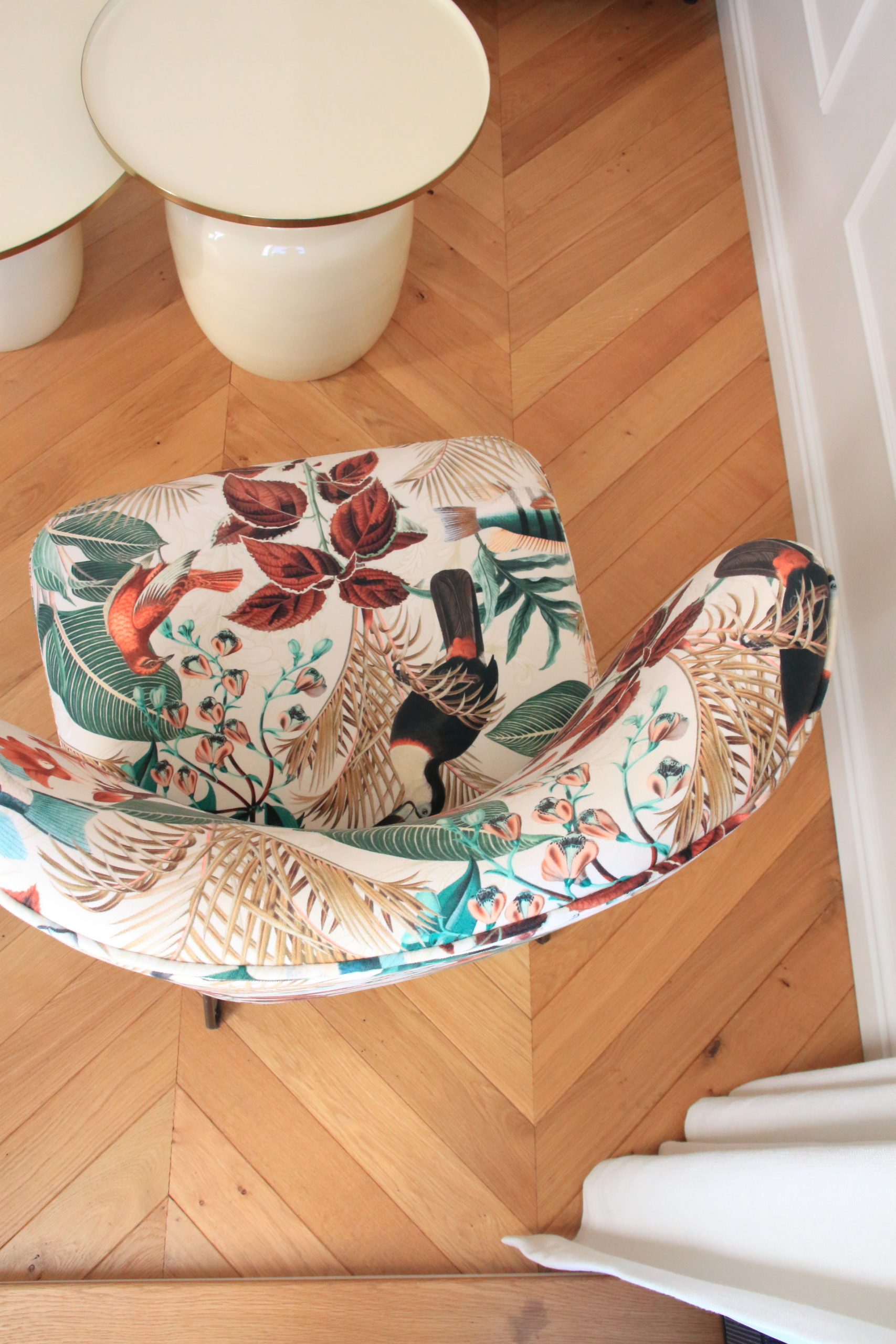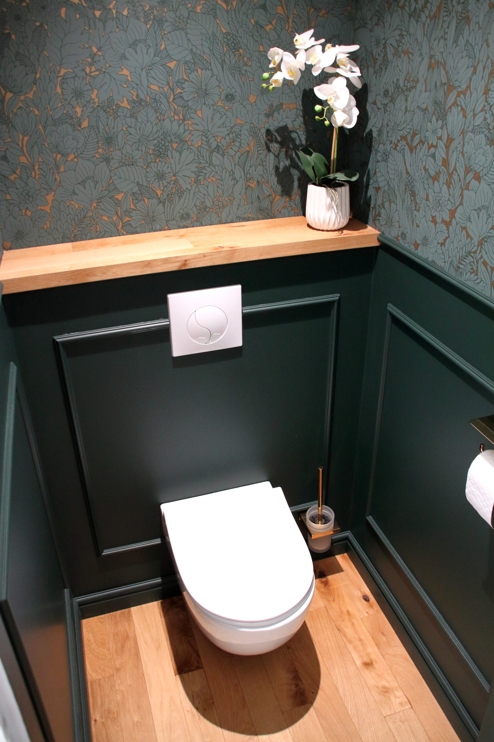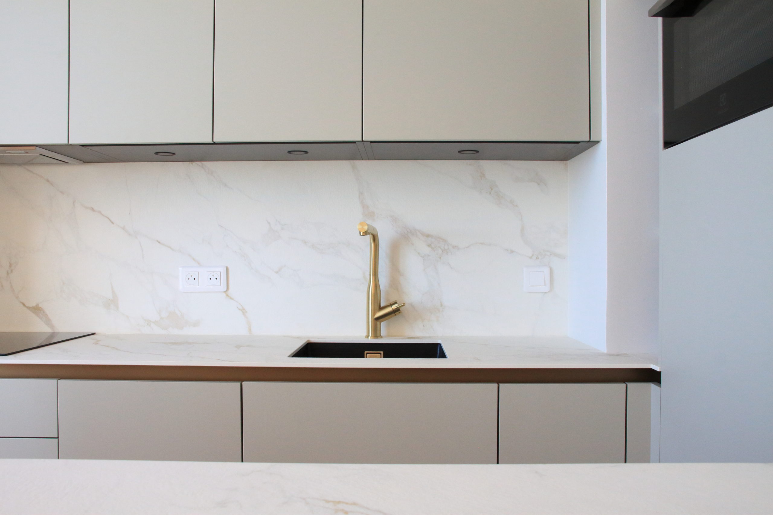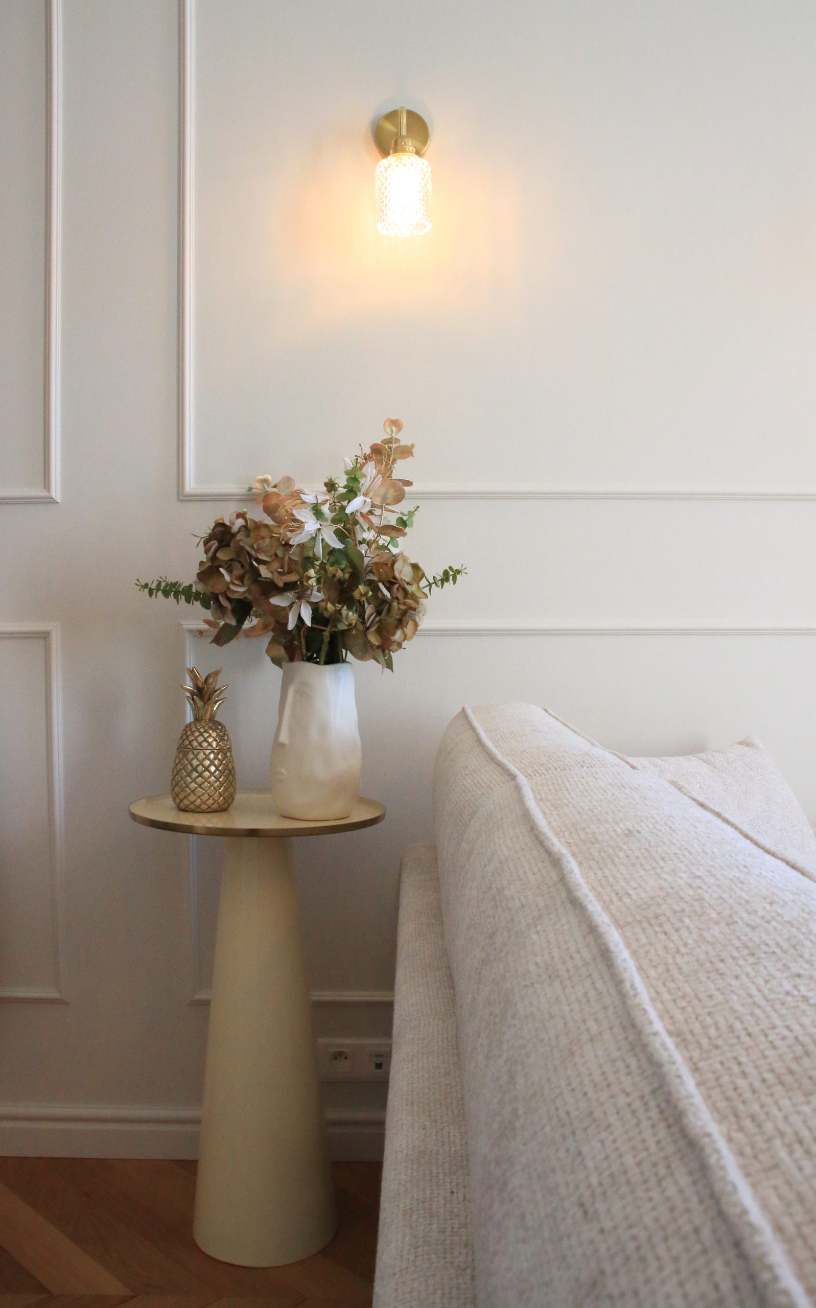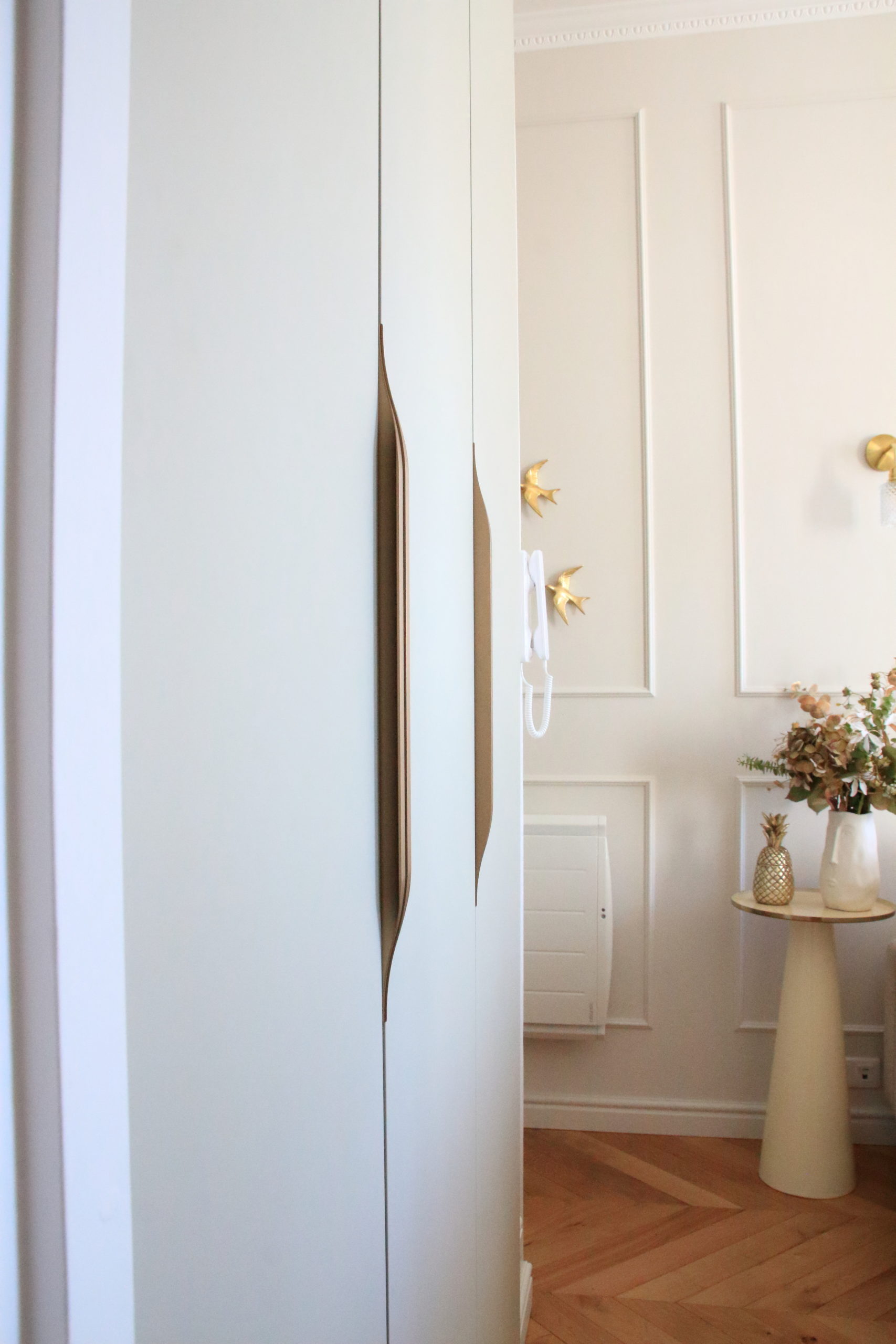 Un nouveau parquet en pointe de Hongrie, de belles moulures aux murs, des tissus lumineux et chaleureux, une cuisine épurée et fonctionnelle apportent à ce petit espace toute son élégance.